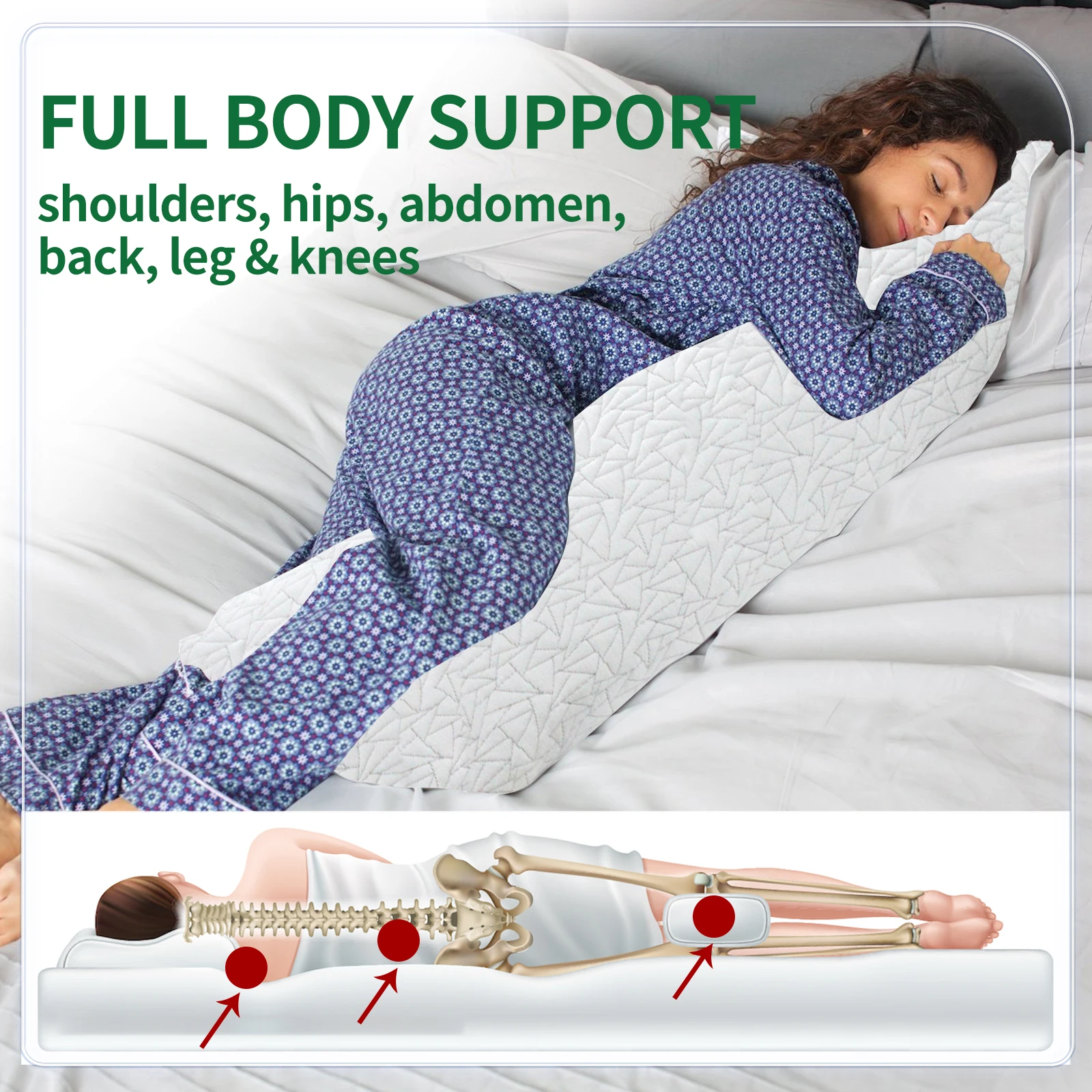 Memory foam body pillow provides comfort and is flexible for creating elevation when need for acid reflex or sitting up right in bed when not feeling well.